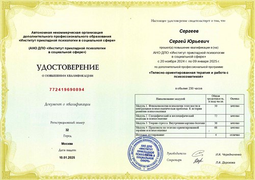 Я профессиональный практикующий психолог с 2012 года. Сертифицирован и работаю в двух направлениях: телесно-ориентированная терапия и гештальт-терапия. На протяжении всего времени прохожу различное обучение в сфере психологического и психосоматического здоровья человека. Систематически прохожу личную терапию и супервизию. Провожу учебные, терапевтические и учебно-терапевтические группы. Ведущий открытых воркшопов на различных фестивалях посвящённым психосоматическому здоровью человека. Множество часов практической работы, связанной с темами психосоматических расстройств, а также с различными видами конфликтов в отношениях на разных стадиях с людьми и с самими собой. Также много опыта работы с паническими атаками, депрессией и различными тревожными состояниями. Страхами публичных выступлений, застенчивостью, стыдом и заниженной самооценкой. Фобиями и навязчивыми состояниями. С эмоциональной зависимостью и границами в отношениях, обидами и чувством вины. Возможно вас одолевают сомнения и вы нуждаетесь в поиске решения и поддержки. Все эти темы можно прорабатывать со мной. Выбор формата встреч и длительность, зависит от цели, которую вы перед собой ставите. Возможно, это одна или несколько консультаций для решения конкретной ситуации. А возможно это длительная работа с характером.